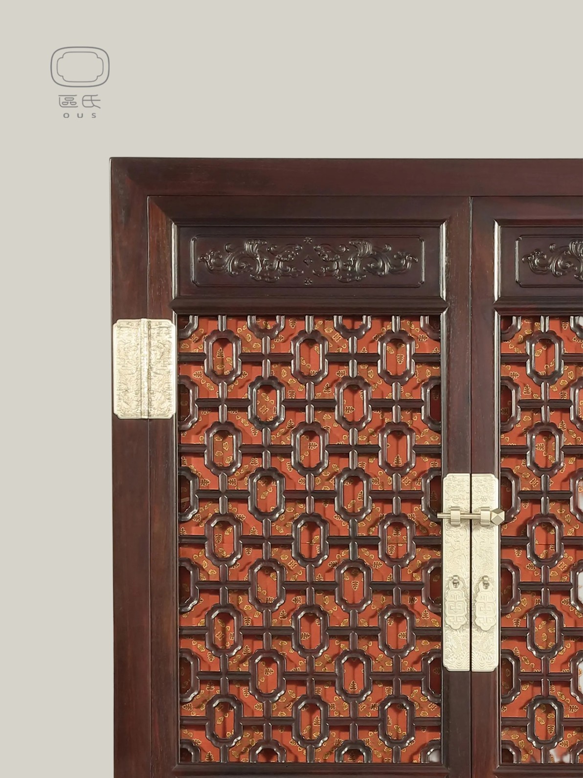 此方角柜造型方正穩(wěn)定,柜門和側(cè)幫滿飾,或攢斗,或浮雕,整件家具富麗堂皇,華貴典雅。